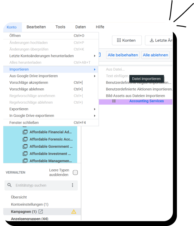 Einfach das fertige CSV-Template hochladen, Budget anpassen und sofort mit performanten Anzeigen durchstarten – ganz ohne komplizierte Einrichtung.